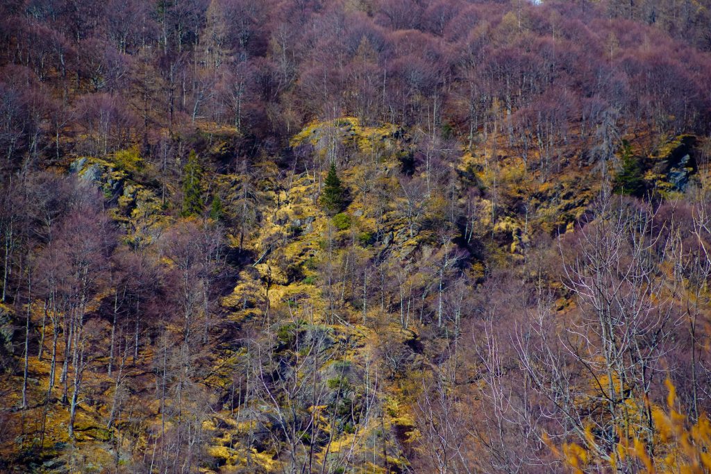 Sul versante opposto a dove abito, essendo esposto a sud, la neve si è già sciolta. Al posto del bianco sono riapparsi i colori della terra e delle rocce. In questo momento prevalgono con i loro marroni, gli ocra, i senape, scarsi i verdi, limitati alle macchie degli abeti. Presto però si risveglieranno le erbe, i cespugli, le betulle, gli aceri, i faggi e tutti gli altri alberi e il versante si tingerà di verde, prima chiaro e tenero e via via sempre più saturo. Sarà la primavera che oggi un capriolo chiamava con il suo abbaiare insistente.